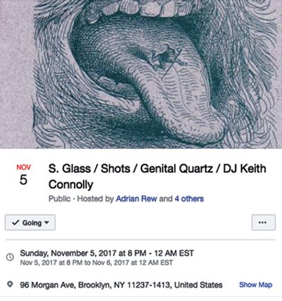 Genital Quartz (aka Sinuba Dreem) goes first and performs an assured theatrical piece that incorporates props, movement, audience interaction, video, and pre-recorded audio. However, as a self-described harsh noise boy, Sinuba wouldn’t use the term “theater” to tag what they does. Too nerdy. “A lot of what I do,” they explains, “incorporates either an aspect of performance or video, depending on whether I am performing the music live or not. In this case I chose to fly [from Oakland, California] without all of my gear because I have a weird name for TSA and it is almost always a complete nightmare.”