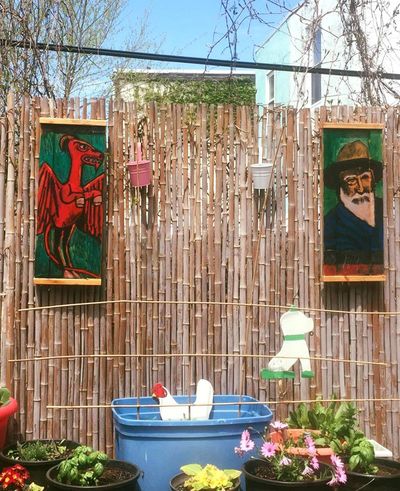 A double-sided painting outside the bathroom is another deeply moving work by Rick Borg from Columbus, Ohio. It was a gift from Mike Rep. Tiberius says he met Rick later, when he lived in a studio apartment above Larry’s Bar. Painted on scrap plywood, it depicts a red bandito in a bowler hat next to the legend “Do I Feel A Little Crazy.”