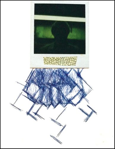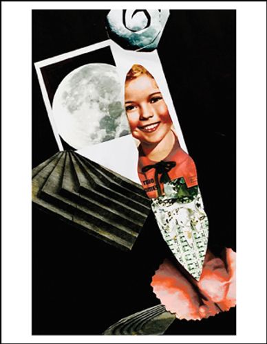 Unique 5.25 x 4.625 objet constructed of printshop defects and old album covers, with affixed screen and glow-in-the-dark paint. Stamped and numbered